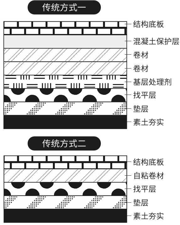 传统方式一弊端 地下室底板迎水面柔性防水层一般都不是直接粘贴于主体结构一地下室底板上,而是铺设或粘结在地下室底板垫层上,柔性防水层上再浇筑细石混凝土或水泥砂浆保护层,然后再在保护层上扎钢筋、施工主体结构-地下室底板。这样,柔性防水层与需防水的结构主体实际上是不密贴的,防水层与结构底板之间容易产生剥离脱落。